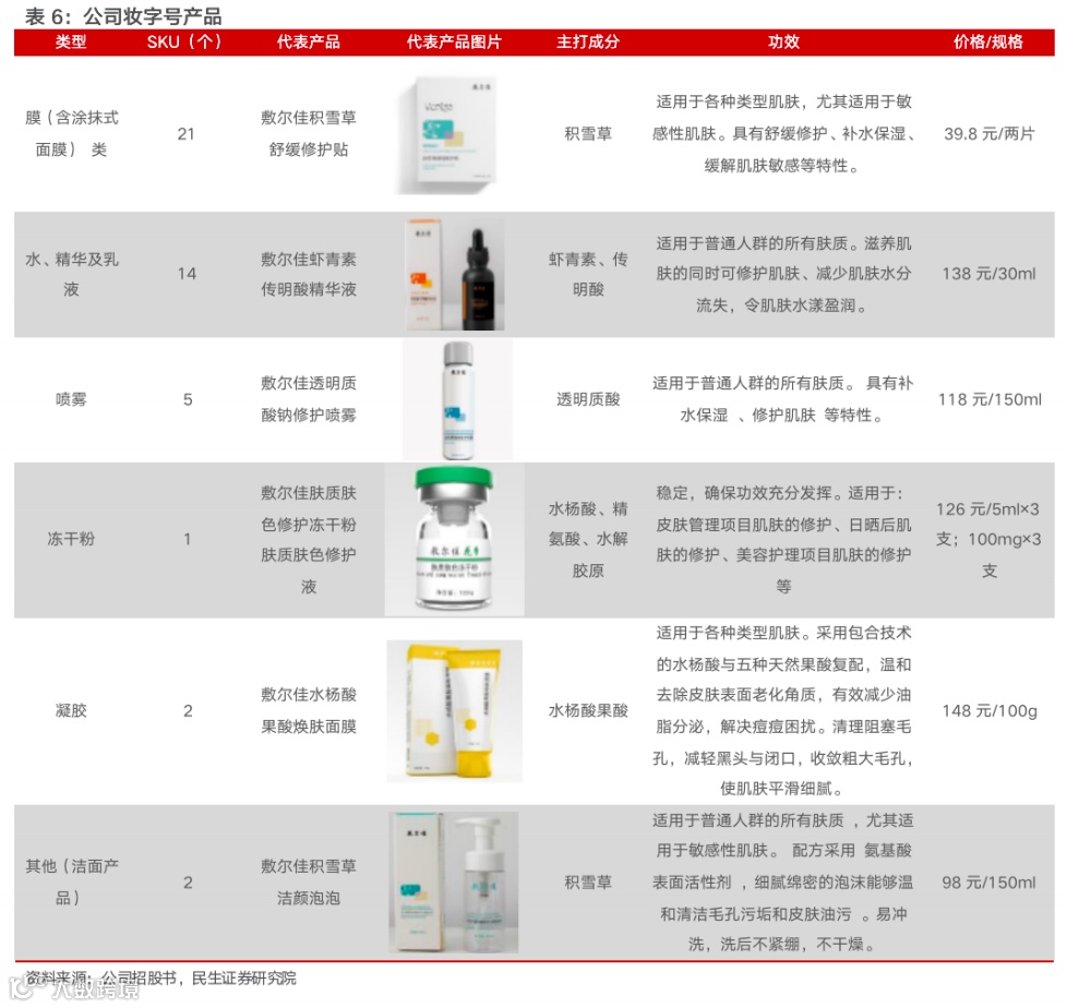 2)妆字号产品涵盖贴、膜类、喷雾、水乳精华、冻干粉、洁面以及凝胶类,共45款SKU。公司的妆字号产品丰富,功效以及应用场景多样,其中面膜类妆字号产品拥有21款SKU,水、精华及乳液类妆字号产品拥有14款SKU。成分角度来看,也具备多样化功效性,包括积雪草、虾青素、传明酸、水杨酸、水杨酸果酸等;从价格跨度来看,公司妆字号产品价格主要分布在30元-150元的区间内。