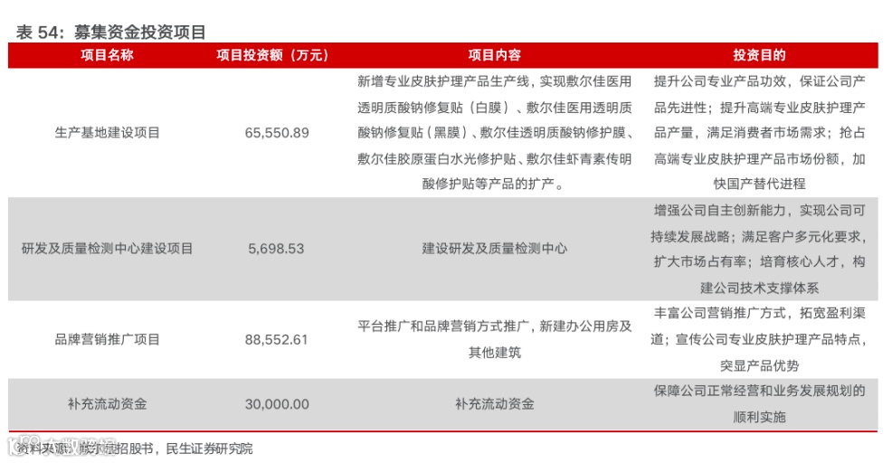敷尔佳募集资金主要运用在生产基地建设项目、研发及质量检测中心建设项目和品牌营销推广项目,形成生产、研发、宣传多维强化的战略布局。