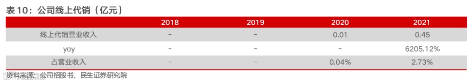 2020年起,公司开启线上代销模式。2020-2021年公司线上代销模式收入占比由0.04%提升至2.73%,主要通过与阿里健康大药房、天猫超市、京东等大型B2C平台签署购销协议,B2C平台进行网络代销获得分成佣金。