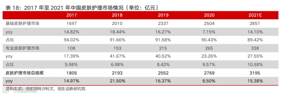 专业皮肤护理市场增速高于基础皮肤护理市场,市场占比稳步提升。根据弗若斯特沙利文预测,基础皮肤护理产品市场规模由2017年的1697亿元增长至2021年的2857亿元,复合年增长率为13.91%;专业皮肤护理产品市场规模由2017年的108亿元增长至2021年的338亿元,复合增速为33.01%,专业皮肤护理市场规模增长表现突出。