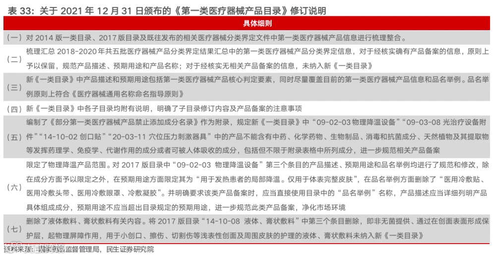产品端:具备一定研发能力的企业,具备更强的拿证能力将成为其核心产品端优势。当前市场监管严格,在2021年12月31日颁布的《第一类医疗器械产品目录》修订说明里删除了液体敷料、膏状敷料有关内容。将非无菌提供、通过在创面表面形成保护层,起物理屏障作用,用于小创口、擦伤、切割伤等浅表性创面及周围皮肤的护理的液体、膏状敷料移出新《一类目录》。其对第一类器械的标准进行了更加严格的规定要求,对产品品类,产品成分,产品命名等都给出了详细的规范,这一举措显然加大了行业的进入壁垒,而对于具备一定研发实力和较强的拿证能力的企业而言,他们拥有一定的先发布局优势进一步享有行业向上的红利。
