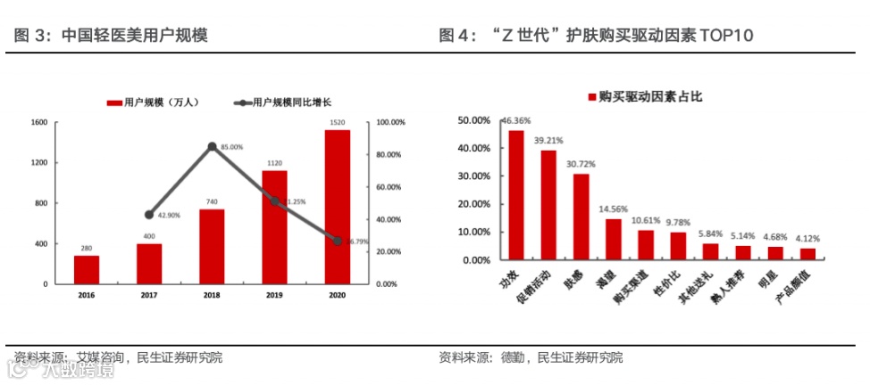 1)轻医美用户规模上行,贴式敷料用户渗透率持续提升。2016年至2020年间轻医美用户规模不断增长,2020年用户规模达1520万,2016-2020年用户规模CAGR达到52.6%。消费者在光电/注射类项目过后,通常需要早晚敷医用面膜进行修复,轻医美用户的规模快速增长较大程度拉动了贴式敷料需求人群。