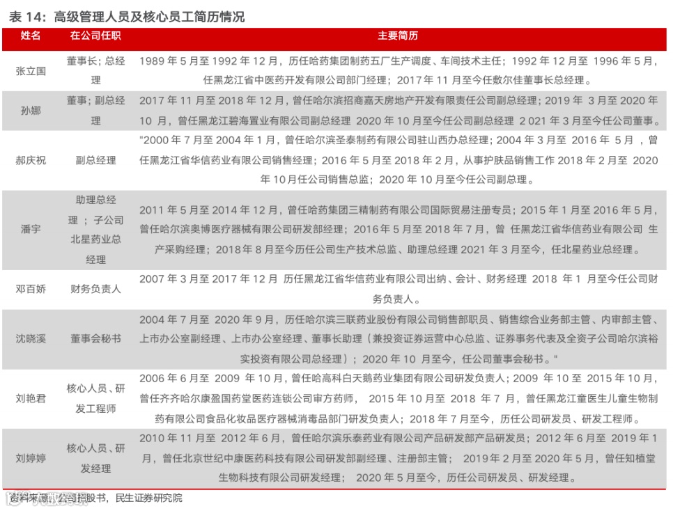 高管团队大多具备医药相关背景:实控人张立国具有执业药师,高级工程师,具备超过 30 年中药、西药的研发生产及运营经验;主导研发并推出公司主要在售产品医用透明质酸钠修复贴产品;潘宇为生物制药专业,超过 15 年中药、西药、医疗器械等产品研发及技术优化经验;创立公司后,总体负责医疗器械,化妆品产品的研发、生产等工作。管理层的专业化背景为公司的专业化发展奠定了基础。