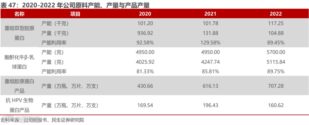 2)长期:产品储备丰富,产能持续扩大。公司正在开展重组Ⅲ型、Ⅰ型及ⅩⅦ型人源化胶原蛋白为核心成分,可应用于宫腔灌注(妇科生殖)、妇科、外科、泌尿科、骨科、心血管科、口腔科等多种领域的产品开发,以及抗病毒新药的研发。产能方面,随生产工艺的改进、生产效率的提升以及市场需求的增长,原料、终端产品产量产能持续增长。