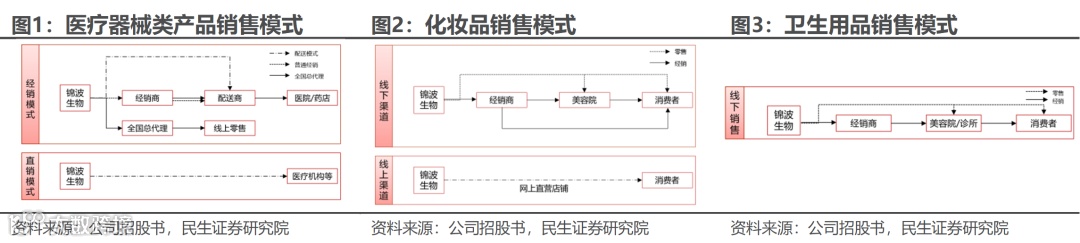 公司三大类产品销售模式不一。①医疗器械类产品销售模式:二类械产品采用经销为主的销售模式,最终流向医院、药店等医疗机构,经销模式下,公司以卖断方式将产品销售给经销商、全国总代理商或配送商,再由其销售给医院、药店等终端客户,具体可分为普通经销模式、配送经销模式及全国总代理模式;三类械产品则通过直销模式销售给医疗机构。②化妆品销售模式:采用线下和线上两种渠道进行销售,公司以功能蛋白为核心,化妆品类终端销售处在初期发展阶段,终端产品销售以经销模式为主,随着电子商务的快速发展,逐步建立线上直销渠道。③卫生用品销售模式:主要通过经销模式销售给专业美容院或诊所,最终销售给消费者。