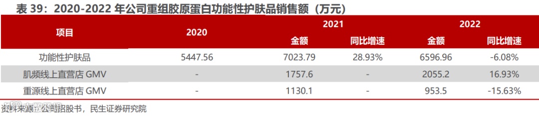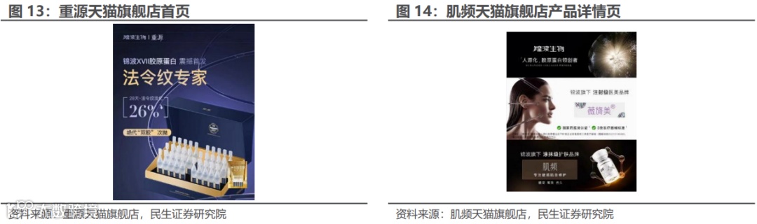 功效性护肤品线上线下同步布局,强化品牌宣传,加深消费者对锦波生物认知,进一步反哺公司械字号和妆字号产品销售。妆字号产品布局渠道广阔,线下销售给美容院或通过零售方式销售给消费者,线上在天猫商城、抖音、京东等网上平台开设店铺,直接向消费者销售,网店包括等。妆字号产品品牌宣传方面,与锦波生物强绑定。肌频、重源天猫旗舰店首页均包含锦波生物LOGO,并在产品详情页对锦波生物、薇旖美进行简要介绍,不断深化消费者对锦波生物技术实力的认知,进一步反哺械字号产品和妆字号产品的销售。