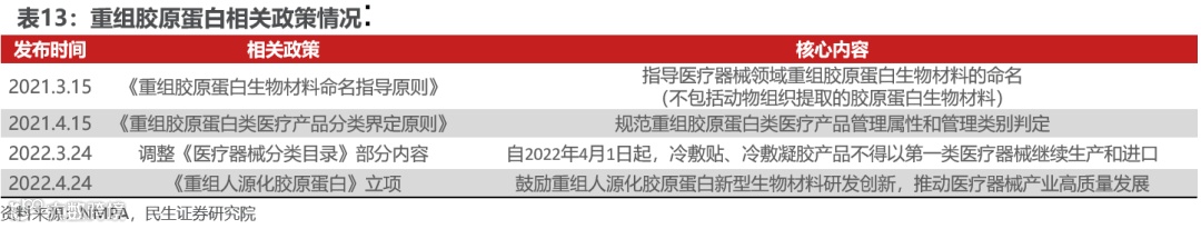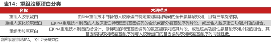国家药监局通过制定标准、规范行业,推动重组胶原蛋白的研发和成果转型。重组胶原蛋白作为新型生物材料的典型代表之一,国家药监局高度重视其标准化工作,过去两年内持续颁布相关法则,通过快速立项、快速制定标准通道,以创新监管思路加快推进创新成果转化。当前根据国家药监局发布的《重组胶原蛋白生命材料命名指导原则》,基于蛋白质组成和结构,重组胶原蛋白可分为重组人胶原蛋白/人源化胶原蛋白/类胶原蛋白三大类型。