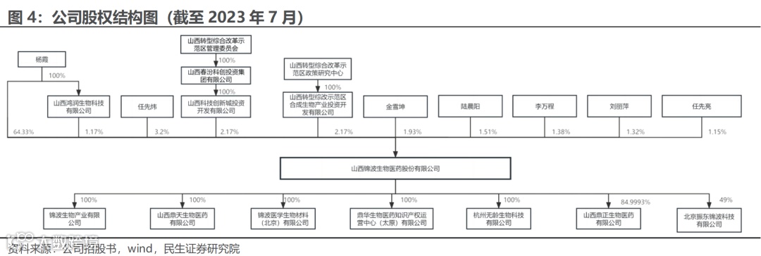 公司实控人为杨霞女士,公司整体股权结构集中稳定。截至2023年7月,杨霞直接持有公司 64.33%的股权,并通过山西鸿润生物科技有限公司间接持有公司 1.17%的股权,共计持股65.5%;公司董事兼总经理金雪坤持股1.93%,公司董事兼副总经理陆晨阳持股1.51%,公司董事兼副总经理李万程持股1.38%。公司股权结构稳定、股权集中于核心高级管理人员及研发团队,有利于公司的持续创新与长期发展。