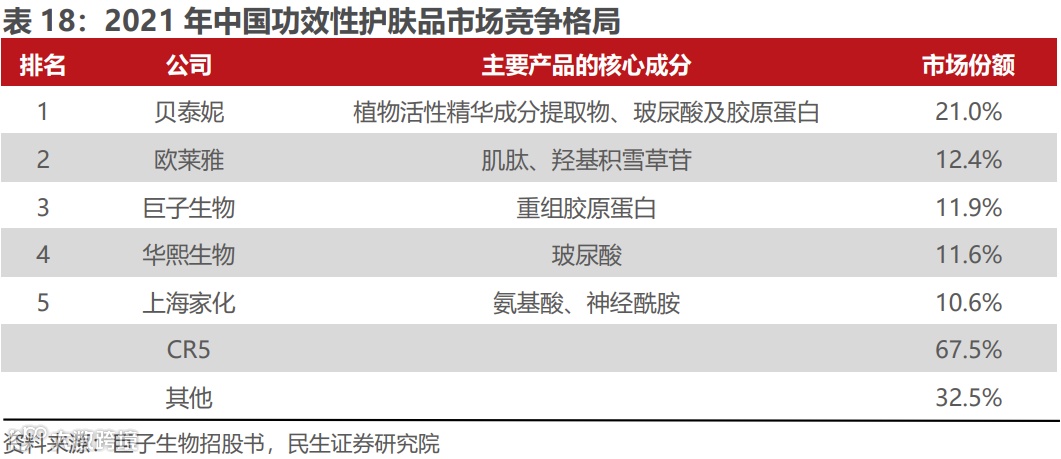 消费者呈现持续较高需求的功效聚焦于保湿、抗氧化及抗衰和美白祛斑,各企业通过与需求功效及对应活性成分绑定,形成消费者强品牌意识,进一步占领市场份额,呈现出功效性护肤市场集中度较高。中国功效性护肤市场中,前五大企业分别为贝泰妮、欧莱雅、巨子生物、华熙生物和上海家化,CR5达到67.5%,远高于护肤品市场CR5(不到25%)。