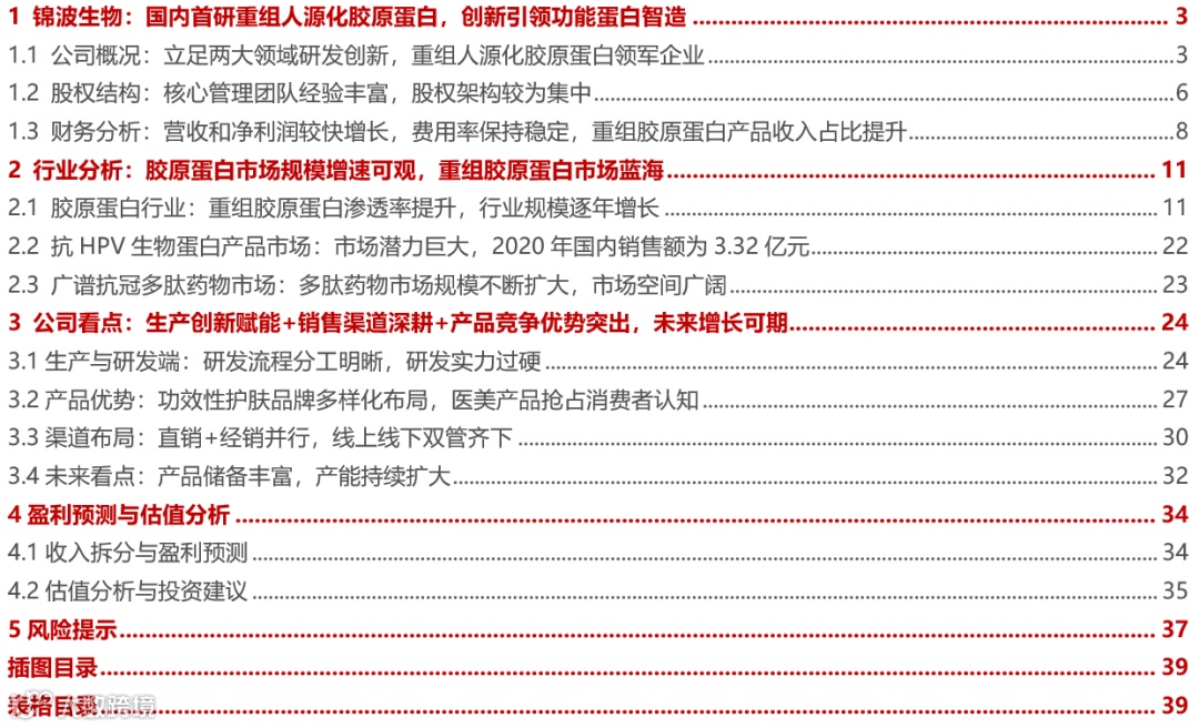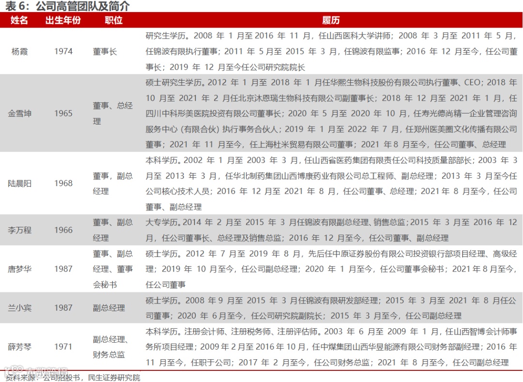 公司创始人为生物工程高级工程师,生物科学领域从业经验丰富。创始人杨霞女士是复旦-锦波功能蛋白联合研究中心副主任,川大-锦波功能蛋白联合研究室副主任,曾任教于山西医科大学;公司核心管理团队皆具备丰富的从业经验,董事兼总经理金雪坤曾先后在百胜(深圳)、华熙生物、北京沐恩瑞等公司担任执行董事、副董事长等职务;董事兼副总经理陆晨阳曾先后在山西省医药集团、华北制药集团等公司担任核心技术人员及工程师职务,生物科学领域从业经验丰富。