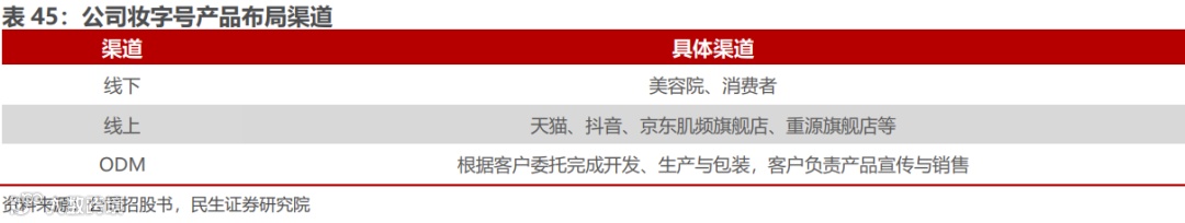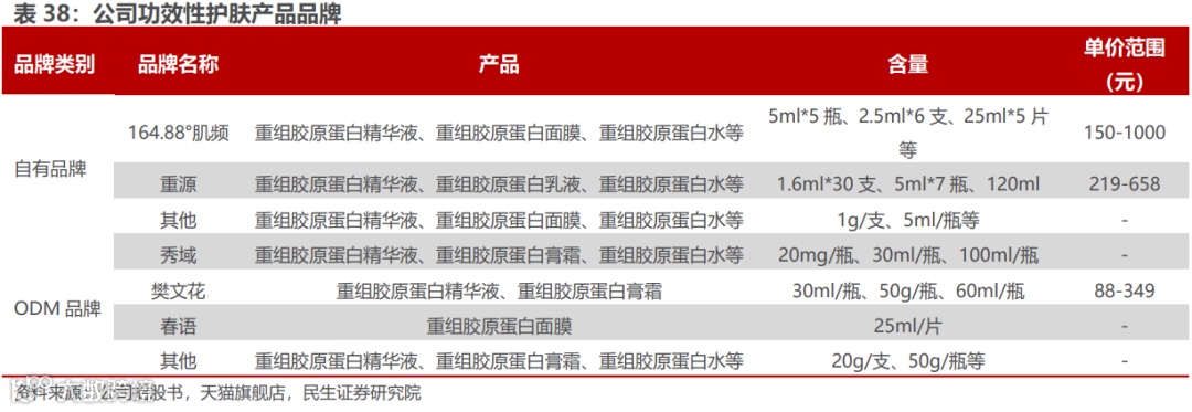 公司功效性护肤产品多样化品牌布局,差异化定位市场。自有品牌主要有 164.88°肌频/肌频、重源等;ODM 模式下,客户品牌主要有樊文花、秀域等,产品主要为重组胶原蛋白精华液、重组胶原蛋白面膜、重组胶原蛋白膏霜等,品牌种类多样,产品丰富。
