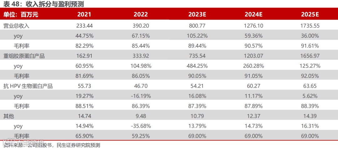 ①重组胶原蛋白产品:公司重组胶原蛋白产品具体分为医疗器械、功能性护肤品、原料与卫生用品。重组III型人源化胶原蛋白冻干纤维薇旖美是目前国内唯一可用于注射的重组胶原蛋白三类医疗器械,具有较强的独特性与创新性,因此产品竞争优势突出,竞争壁垒较强。2022年,重组III型人源化胶原蛋白冻干纤维薇旖美®极纯(4mg/瓶)贡献收入1.17亿元,占总营收的29.87%,单价视角:随着薇旖美®至真III型(10mg/瓶)上市,薇旖美单价有提升趋势;消费者对于眶周抗衰与面部抗衰的需求持续向上,注射类重组胶原蛋白类产品具备稀缺性,随着薇旖美覆盖更多终端医美机构,预计公司薇旖美产品销量保持高增,拉动重组胶原蛋白产品的收入持续上行。因此预计23-25年重组胶原蛋白产品分别实现收入7.36、12.03、16.57亿元,分别同比+484.25%、+260.28%、+125.27%。随着高毛利率的重组III型人源化胶原蛋白冻干纤维占比提升,该项业务的毛利率有望保持上行趋势,预计23-25年毛利率分别为90.05%、91.05%与92.05%。