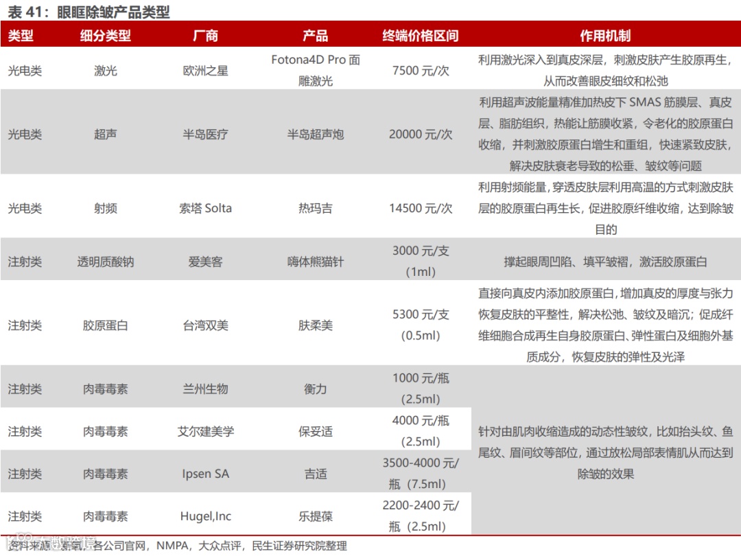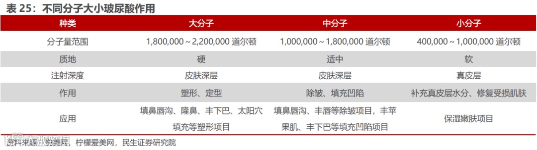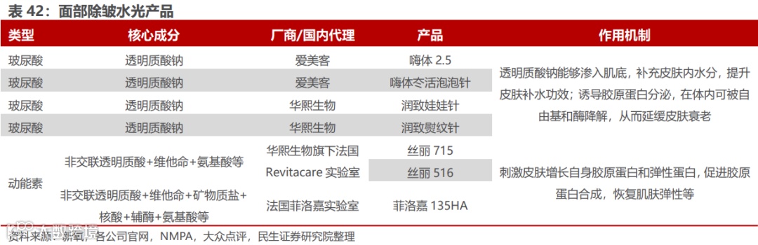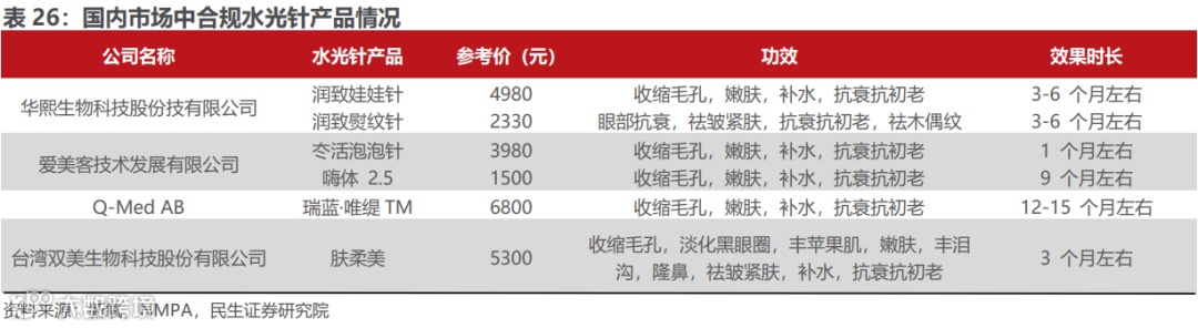由于水光针类产品纳入 III类医疗器械管理范畴,当下合规产品数量不多,除了双美的胶原蛋白水光产品外,包括爱美客的嗨体2.5ml,冭活泡泡针,华熙生物的熨纹针、娃娃针,Q-Med的瑞蓝唯缇。
