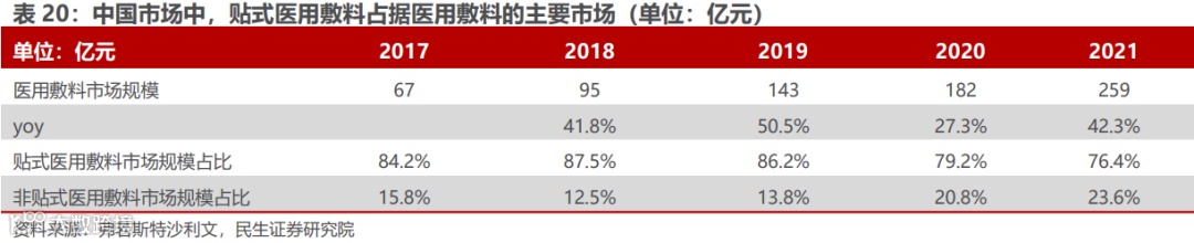 医用敷料定义为辅助治疗产品,用于医疗手术、损伤、慢性湿疹和过敏性的皮肤修护需求。对应核心消费人群分为三类:一类为具有痤疮、皮炎等皮肤问题的患者,一类为接受轻医美手术后急需皮肤修复的医美人群,一类为追求功能性护肤的消费者。在三类人群需求不断驱动下,我国贴片式医用皮肤修复敷料市场近年来高速增长,2021年终端销售市场规模达到259亿元,同比增速为42.3%。按产品类别分,又可分为贴片式和非贴片式医用皮肤修复敷料两大类,其中贴式敷料产品市场需求较高,2021年贴式医用敷料市场规模占比76%。