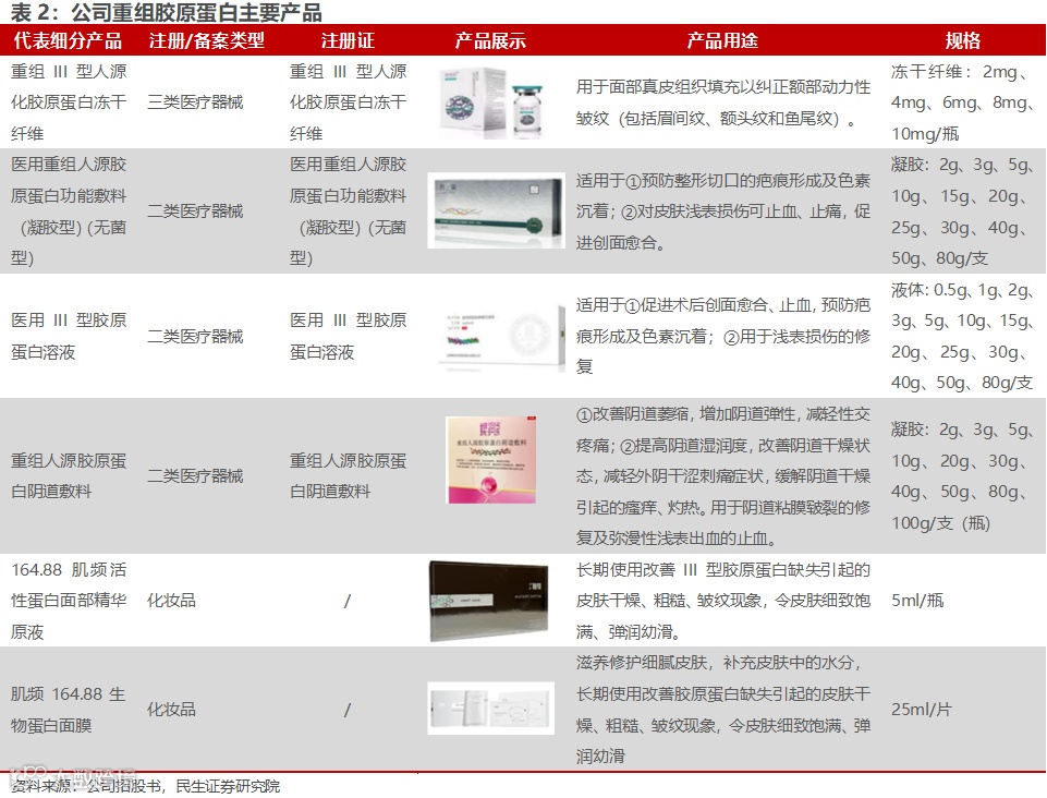 1)重组胶原蛋白业务方面,布局包括三类医疗器械产品重组Ⅲ型人源化胶原蛋白冻干纤维,用于面部皱纹修复;重组胶原蛋白凝胶、溶液、敷贴等二类医疗器械产品,用于创面及阴道黏膜修复;以及肌频胶原蛋白面膜、重组胶原蛋白精华液等功效性护肤产品。
