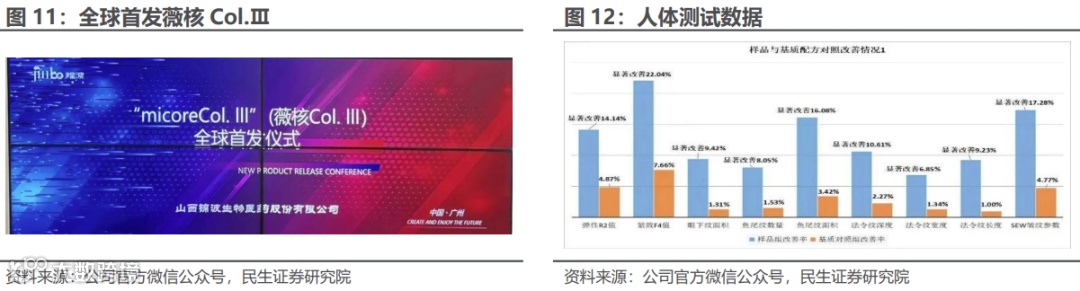 重组胶原蛋白产品薇旖美先发性布局市场。薇旖美极纯重组Ⅲ型人源化胶原蛋白冻干纤维于2021年6月29日经国家药品监督管理局批准正式上市,并于同年9月16日全球首发。薇旖美重组Ⅲ型人源化胶原蛋白以“164.88°”为特点,通过重建胶原蛋白网状结构,实现多层抗衰,主要优势为:①与人Ⅲ型胶原蛋白高活性功能区氨基酸序列100%匹配,②呈现164.88°,具备完整的、结构明确的三螺旋结构。目前,国内胶原蛋白注射类产品材料主要为牛胶原、猪胶原等,薇旖美是国内首款三类械重组胶原蛋白合规性产品,先发性布局市场的同时,也加深了消费者对品牌的认知。