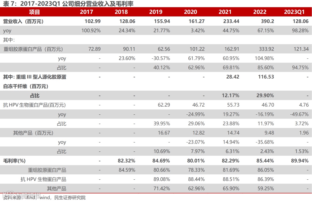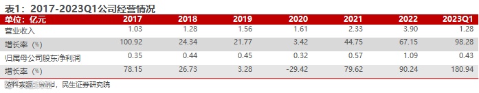 公司围绕生命健康新材料和抗病毒领域,打造国家级“专精特新”小巨人企业。公司应用结构生物学、蛋白质理性设计等前沿技术,从事以重组胶原蛋白产品和抗HPV生物蛋白产品为核心的各类医疗器械、功能性护肤品的研发、生产及销售。公司成功研发的重组 III 型人源化胶原蛋白于2021年6月获国家药品监督管理局批准上市,是目前唯一注射级别的重组Ⅲ型人源化胶原蛋白生物医用材料,在重组人源化胶原蛋白领域处于国际技术领先地位。十余年来,公司基于“病毒进入抑制原理”,持续开发抗病毒类功能蛋白,目前已完成抗HPV生物蛋白产品的开发及产业化上市,对降低女性宫颈癌发病率有积极作用。近年来,公司的营业收入与归母净利润保持较快增速,2017-2022年,营业收入由1.03亿元增至3.90亿元,归母净利润由0.35亿元增至1.09亿元,5年CAGR分别为30.5%与25.5%。2023Q1,公司营业收入为1.28亿元,同比+98.28%;归母净利润为0.43亿元,同比+180.94%。