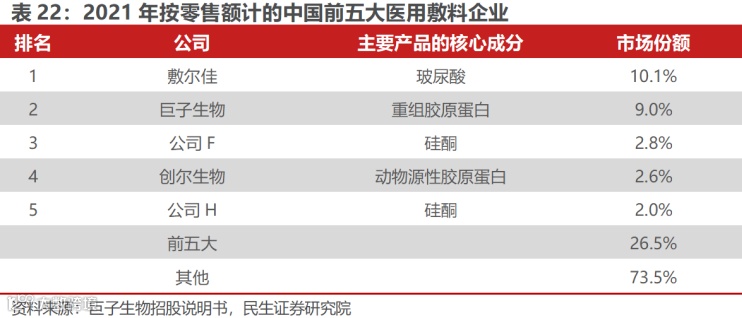 竞争格局角度,国内医用敷料市场两大头部企业分别为以玻尿酸为核心成分的敷尔佳和以重组胶原蛋白为核心成分的巨子生物。2021年,医用敷料市场 CR5 为 26.5%。在胶原蛋白领域,巨子生物实现 23 亿元销售额,占据9%的市场份额,在医用敷料整体行业位居第二,在胶原蛋白医用敷料细分市场中排名第一。
