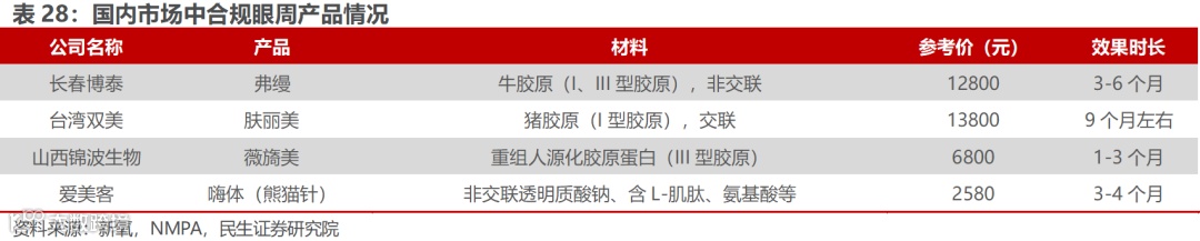 眼周年轻化主要项目包括眼部抗衰祛皱纹、丰泪沟、淡化黑眼圈、去眼袋、丰卧蚕、去肿眼泡等方案。胶原蛋白由于其特性和优势,在眼周项目中的丰泪沟、淡化黑眼圈,效果更为自然、皮肤更加滋润,优势显著。主要产品弗缦、肤丽美、薇旖美等胶原蛋白产品用于填充/丰泪沟、淡化黑眼圈、祛眼周细纹。