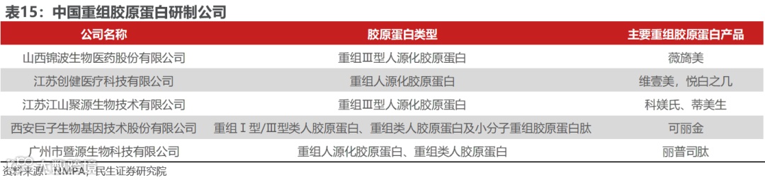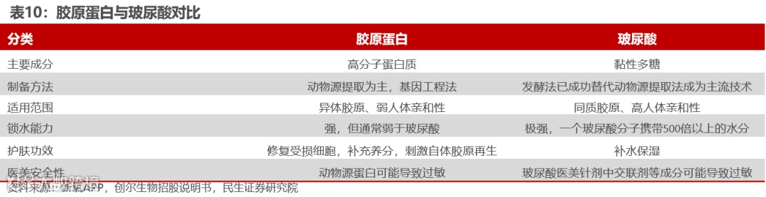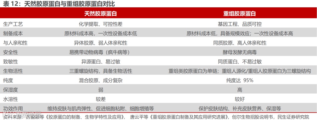 消费者呈现需求多样化,而非单一聚焦补水,胶原蛋白更符合消费需求下的发展趋势。对于痤疮、皮炎等皮肤问题的患者对于祛痘美白的需求日益增长;轻医美流行后,术后人群急需具有保湿、修复效果的皮肤护理产品;追求功效性护肤的消费者则愈发注重各类活性成分在解决肌肤问题上的高效性。相比于玻尿酸相对单一的补水功效,胶原蛋白具有修复保湿、美白抗衰、润滑肌肤等多重功效,其中重组胶原蛋白的功效性表现突出,而其自身的低致敏性和更易量产能力,有望满足消费者日益增长的皮肤护理和修护需求。