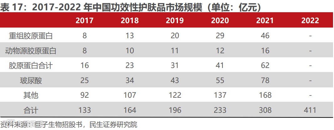 消费升级+护肤需求精细化,为功能性护肤品提供滋生发展土壤。当消费者对于外在形象和美容保养观念不断加深;精细化护肤需求增加,消费者开始从基础护肤转向寻找更适合的功能性护肤品,在此背景下差异化、高附加值、科技感专业化程度高的功能性护肤品已经被越来越多的消费者所接受。巨子生物招股书显示,截至2021年,中国功效性护肤品市场规模达308亿元,五年内CAGR达26.32%。胶原蛋白作为兼具美白、修护、补水等功效为一体的原料,对应呈现出市场规模快速上行,从2017年的16亿元上升至2021年的62亿元,其中重组胶原蛋白由8亿元上行至46亿元。