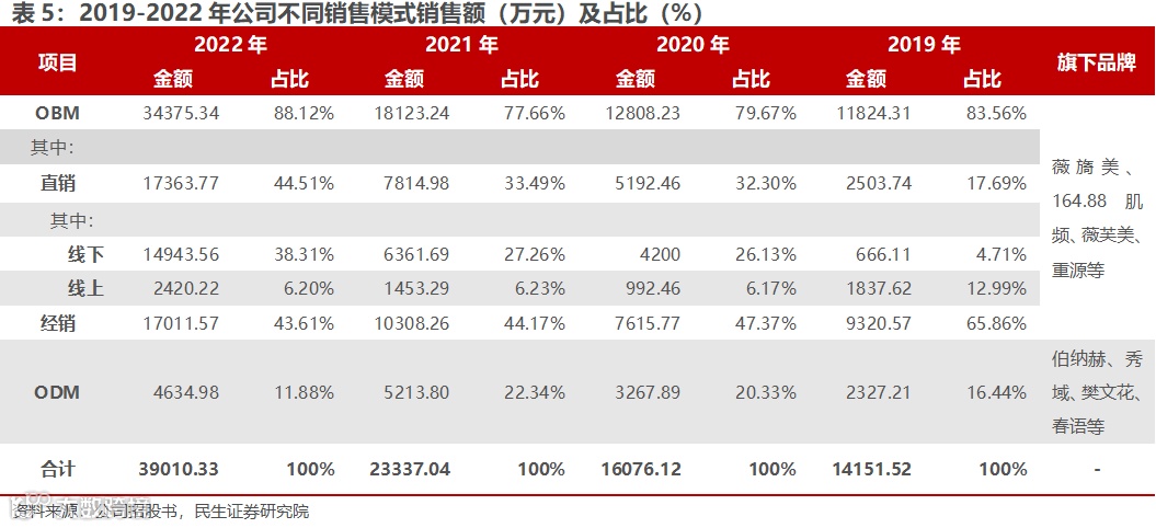 从销售模式收入占比角度看,主要分为OBM模式(公司生产、销售自有品牌产品)和ODM模式(根据品牌方客户委托自助完成功能性护肤品与医疗器械产品开发与生产工作)两种销售模式。其中,公司OBM模式销售收入占比较高,且直销渠道占比逐年提升。2022年,OBM的销售收入为34375万元,占比88.12%,其中,直销与经销分别占比44.51%与43.61%。随着公司拓宽销售渠道,直销模式收入占比逐年提升,2020-2022年占收入比重为32.30%、33.49%与44.51%。