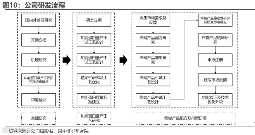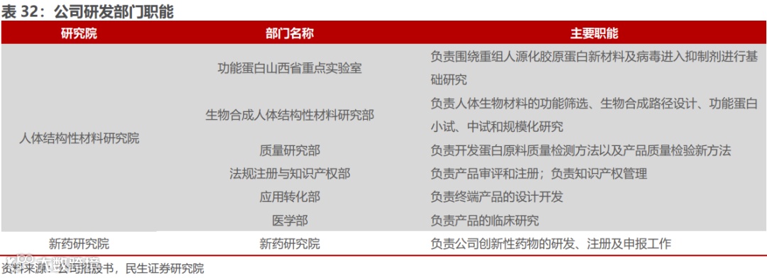 公司研发职能分明、流程清晰,严格把控各环节。公司围绕重组胶原蛋白和抗病毒等领域开展创新研究,目前设立功能蛋白创新研究院,下设人体结构性材料研究院和新药研究院,人体结构性材料研究院包括功能蛋白山西省重点实验室、生物合成人体结构性材料研究部、质量研究部、法规注册与知识产权部、应用转化部、医学部。此外,公司研发流程可划分为基础研究、功能蛋白量产工艺研究、终端产品配方及剂型研发三个环节。生产方面,公司产品生产主要包括核心功能蛋白原料生产与终端产品生产,均采用按计划生产的生产模式。截至2023年6月,公司共有 10 条终端产品生产线、8 条原料生产线。在各方面分工明确有利于公司对研发环节的清晰化管理和把控。