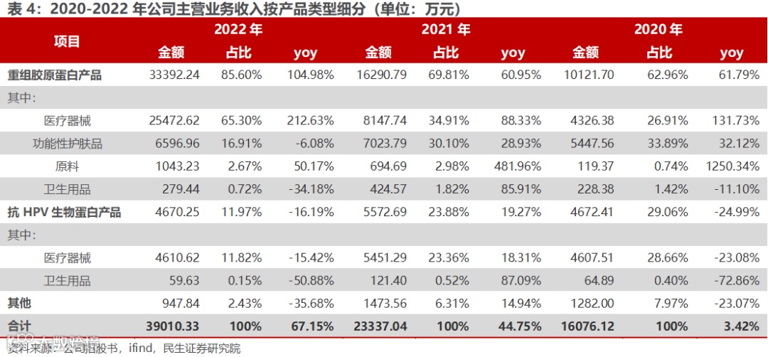 我们将公司的营业收入按照产品进行拆分,具体可分为重组胶原蛋白产品(包括医疗器械、功能性护肤品、原料与卫生用品)、抗HPV生物蛋白产品(分为医疗器械与卫生用品)以及其他产品。