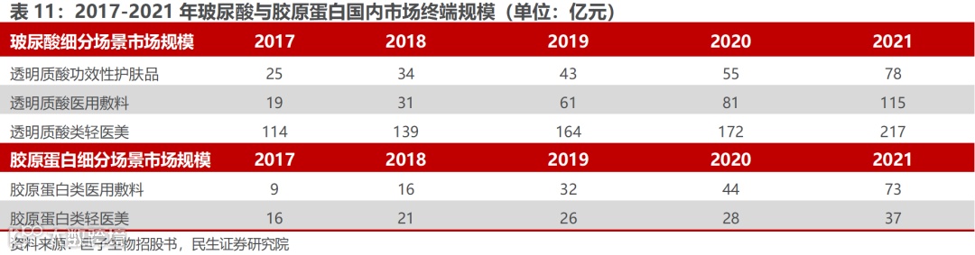 受制于制备方法带来一系列问题,胶原蛋白市场规模与发展速度不及玻尿酸。因胶原蛋白的制备成本较高,且存在一定免疫反应,在应用端的发展速度及规模不及玻尿酸。其中,国内市场中功能性护肤品、医用敷料以及轻医美场景下玻尿酸终端规模均大于胶原蛋白类,且在医用敷料和轻医美场景应用中呈现显著领先优势。