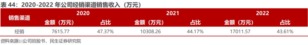线下经销模式布局二类械产品,前瞻性布局经销商资源。公司二类械产品主要采用经销模式布局,有利于累积优质经销商资源,为后续通过经销模式加速布局医美市场打下较好的基础。2020-2022年,公司经销渠道销售收入持续增长,年复合增长率为49.5%。