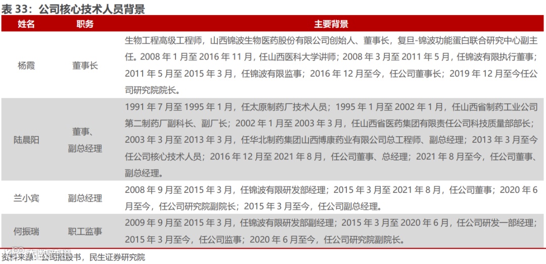 核心管理人员具备丰富研究经历,持续深耕功能蛋白领域。创始人、董事长杨霞女士为生物工程高级工程师,担任公司功能蛋白创新研究院院长、复旦-锦波功能蛋白联合研究中心副主任、川大-锦波功能蛋白联合研究室副主任,致力于功能蛋白的基础研究和产业化。杨霞女士、公司副总经理陆晨阳先生、兰小宾先生与公司监事何振瑞女士为公司核心技术人员,均具备较强的相关领域学术背景。