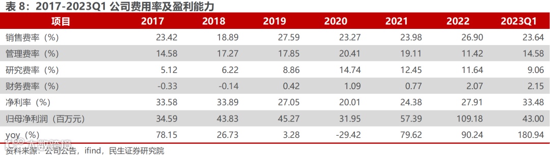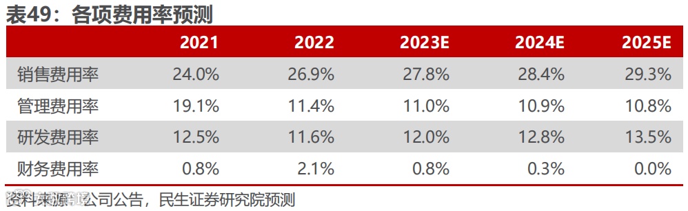 ①销售费用率:2020-2022年,公司销售费用率稳定在23.0~27.0%,随产品宣传推广等不断深入,我们预计2023-2025年公司的销售费用率分别为27.8%、28.4%与29.3%。