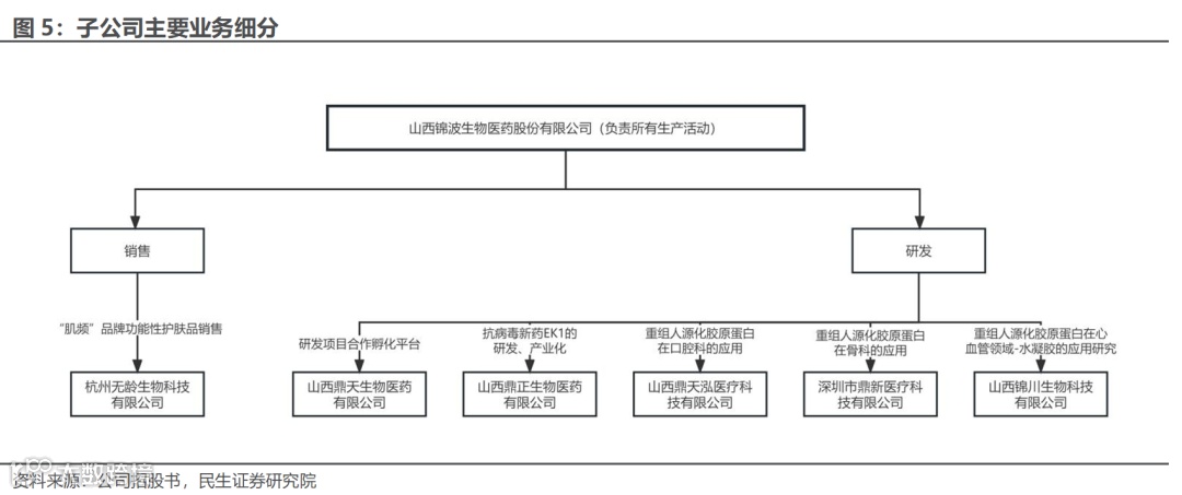 公司业务分工明晰:锦波生物完成全部的生产活动,旗下子公司主要负责研发与销售。①研发方面,旗下子公司山西鼎正生物医药有限公司负责研发抗冠状病毒新药EK1;子公司山西鼎天泓医疗科技有限公司、山西锦川生物科技有限公司及深圳市鼎新医疗科技有限公司分别负责研发重组胶原蛋白在口腔科、骨科和心血管领域的应用。②销售方面,旗下子公司山西锦川生物科技有限公司主要负责肌频系列产品的销售任务。