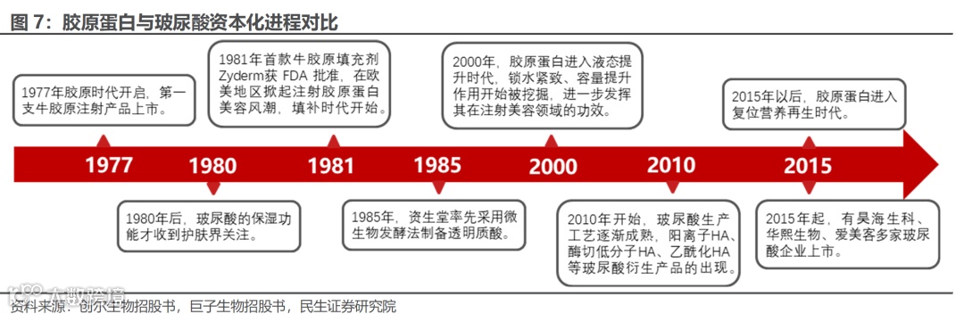 胶原蛋白应用初始期早于玻尿酸,但资本化进程相对落后。1977年胶原时代开启,第一支牛胶原注射产品上市。1981-2000年属于填补时代,1981年首款牛胶原填充剂Zyderm获 FDA 批准,在欧美地区掀起注射胶原蛋白美容风潮。2000-2015 年进入液态提升时代,胶原蛋白锁水紧致、容量提升作用开始被挖掘,进一步发挥其在注射美容领域的功效。2015年以后进入复位营养再生时代。而自1980年后,玻尿酸的保湿功能才受到护肤界关注。2015年起,昊海生科、华熙生物、爱美客等多家布局玻尿酸的企业上市。而胶原蛋白领域,巨子生物于2022年11月在港交所上市;2023年7月,锦波生物成功登陆北交所。