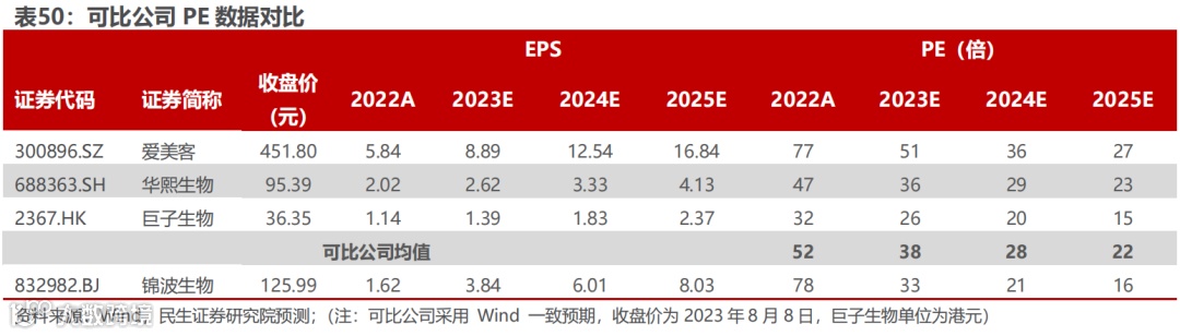 锦波生物作为北交所上市的重组胶原蛋白第一股,其产品薇旖美具备唯一三类械的突出优势,作为医美行业的新材料具备较强竞争壁垒,因此我们选取在A股上市的医美企业爱美客与华熙生物,以及布局重组胶原蛋白产品并于港交所上市的巨子生物作为锦波生物的可比公司。2023年可比公司PE均值为38倍,锦波生物2023年PE估值仅33倍,低于可比公司均值,公司具备突出研发创新能力,产品具备高壁垒,后续研发跟进拉动创新能力上行,以直营为主具备较强产品管控能力,公司战略布局稳健,有望乘行业东风实现快速发展,估值仍有提升空间。