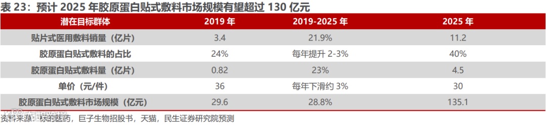 1)根据巨子生物招股书,2019年胶原蛋白类占医用敷料比重为23.1%,我们假设胶原蛋白类占贴式敷料比重为24%,随着重组胶原蛋白研发技术推进,未来以2-3pct速率提升占比,25年达到40%。