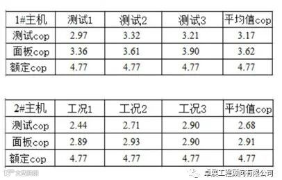 投入运行的两台主机COP测试平均值分别为3.17与2.68,均远低于额定COP值4.77,约为额定值的56%~66%。