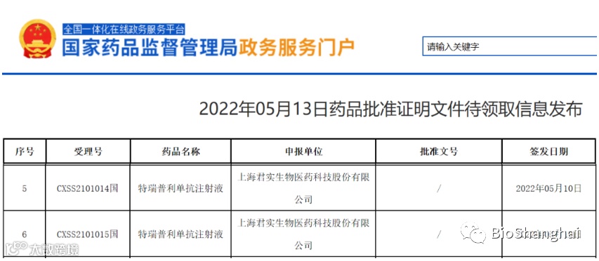 今日(5月13日),根据中国国家药监局(NMPA)官网最新公示,君实生物研发的PD-1抑制剂特瑞普利单抗(拓益)新适应症上市申请已获批。根据公开资料,这也是特瑞普利单抗在中国获批的第5项适应症,具体为:联合含铂化疗一线治疗局部晚期或转移性食管鳞癌。