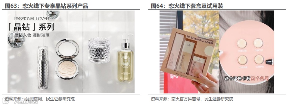 分渠分品提升品牌获客效率和转化率。基于不同渠道消费者特征不同,恋火品牌在不同渠道的产品布局侧重点不同。恋火品牌的线上渠道消费者较年轻,较追求隐形妆感和持久妆效,因此线上渠道主推看不见系列和蹭不掉系列的粉底液、气垫等大单品;线下消费者更加重视产品质感,因此恋火于2022年推出线下专享的晶钻系列产品,主打奢养底妆,结合电镀工艺,通过晶钻入妆打造通透、润养、奢华的贵妇级妆容。此外,线下消费场景具有体验属性,恋火在线下门店推出规格、包装有所差异的产品套装,如中小样试用装或旅行装,吸引线下消费者购买尝试,帮助品牌获客。