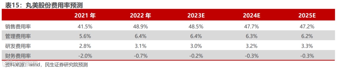 费用率方面,公司推进零售转型与精细化运营,优化自播与达播占比结构,极大自播占比,提升销售费用投放效率,预计2023-2025年销售费用率分别为48.5%、47.7%、47.2%;公司持续推进组织调整和结构优化,加强扁平化管理和组织效能建设,提升管理效能,预计2023-2025年管理费用率分别为6.4%、6.3%、6.2%;公司保持研发投入,预计2023-2025年研发费用率分别为3.0%、3.2%、3.3%;预计2023-2025年财务费用率分别为-0.2%、-0.3%、-0.3%。