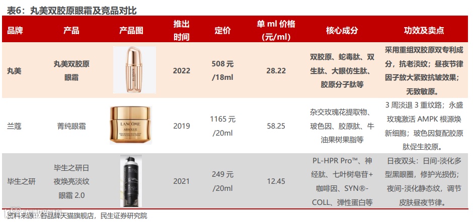 3)双胶原眼霜:采用重组双胶原蛋白技术,主打成分与人体自身的胶原蛋白序列同源,成分活性和稳定性较高;搭配独特的日夜双管设计,日霜配方侧重于保护胶原蛋白不流失、抗氧化,夜霜侧重于修护和促进胶原蛋白生成,进一步提升紧致抗皱效果,丸美较早布局重组胶原蛋白成分的眼霜并叠加日夜双管用法设计卡位眼霜细分成分赛道,且重组胶原蛋白成分兼具较好的抗衰与修复功效,与眼霜品类适配度高,双胶原眼霜有望成为公司下一大单品。