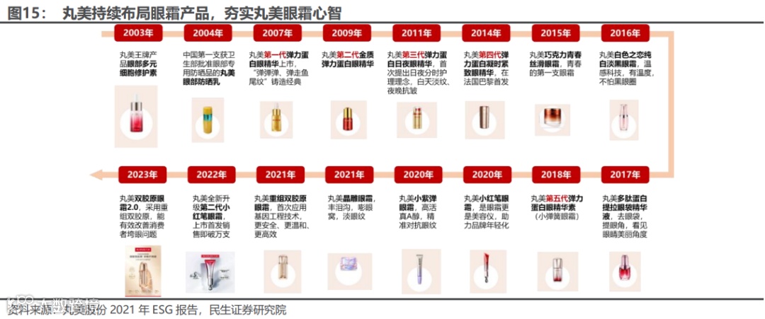 聚焦抗衰领域,持续升级蛋白原料,巩固产品竞争力。丸美品牌成立即定位眼部肌肤护理大师,除基础原料外,公司持续推进抗衰原料研发以优化眼部抗衰解决方案。基于“弹性纤维正常功能的丧失可以解释皱纹、松弛等皮肤老化的临床表现”、“科学家找到从动物体内分离出小分子可溶性弹性蛋白水解物的方法”等科研结果,丸美开始推进弹性蛋白相关研究,并于2007年将从深海鱼类体内提取的弹性蛋白成功应用到其第一代弹力蛋白眼精华,成为首个将弹性蛋白运用到护肤品中的企业;此后,公司围绕弹性蛋白成分打造“第二代金质弹力蛋白眼精华”、“第三代弹力蛋白日夜眼精华”等眼霜产品。
