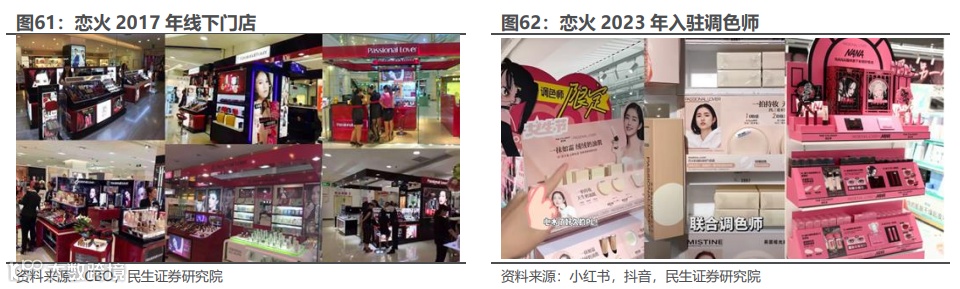 传统CS渠道起家,积极拓展新兴美妆集合店巩固线下渠道竞争力。恋火起源于CS渠道,早期主要进驻高端百货八佰伴、燕莎友谊商城、大悦城、万达广场、来福士、银泰百货等百货商场开设门店;近年来,新生代用户的美妆产品消费呈现出品类多样化和诉求功能化等趋势,囊括众多海内外新兴品牌的新型美妆集合店逐渐获得更多消费者的青睐,同时彩妆产品的体验属性更强,消费者更倾向在现场试用后做出购买决策,美妆集合店渠道有利于新锐品牌的彩妆产品触达更多消费者,因此公司积极拓宽线下渠道,进驻调色师、KKV、屈臣氏、研丽等新兴美妆集合店,以增加品牌曝光和销售;公司公告显示,截至23H1,恋火品牌的线下零售连锁渠道已拓展至近2000家门店。