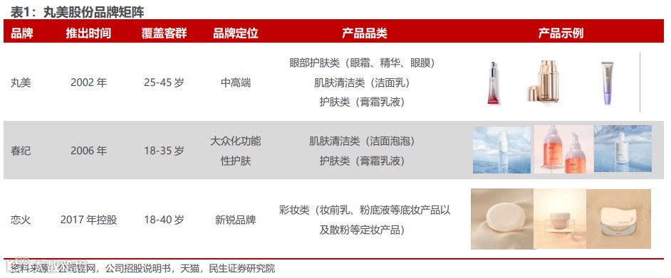 构建以丸美为核心的多品牌矩阵,覆盖护肤、彩妆等品类产品。截至24年1月,公司旗下主要品牌包含:1)主品牌丸美:定位中高端,聚焦眼部抗衰,核心受众为25~40岁群体,覆盖眼霜、面霜、精华、防晒等品类产品;2)“春纪”:定位大众护肤,以“天然食材养肤”为理念,主要为18~35岁女性打造天然护肤方案;3)“Passional Lover恋火”:17年丸美控股恋火正式进军彩妆市场,19年丸美实现对恋火的并购,恋火品牌早期定位以“激情与爱”为品牌内核,定位轻奢韩系彩妆,21年恋火完成品牌焕新,定位新锐彩妆品牌,以底妆类产品为核心,崇尚高质与极简,主要提供粉底液、粉霜、气垫、散粉等底妆产品。