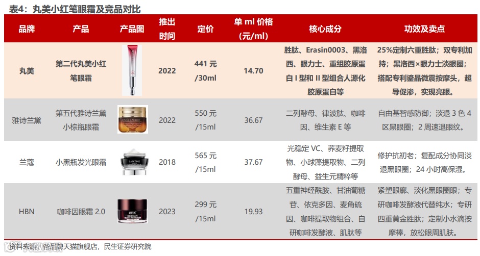 与竞品相比,丸美小红笔眼霜使用胜肽+重组胶原蛋白成分,抗衰能力强于雅诗兰黛小棕瓶眼霜等使用单一胜肽成分的产品;同时小红笔眼霜使用的黑洛西和眼力士成分淡化黑眼圈能力也强于咖啡因成分;小红笔眼霜2.0的单ml价格为14.7元,较相同功效的兰蔻小黑瓶眼霜(37.67元/ml)、HBN咖啡因眼霜2.0(19.93元/ml)更优惠。