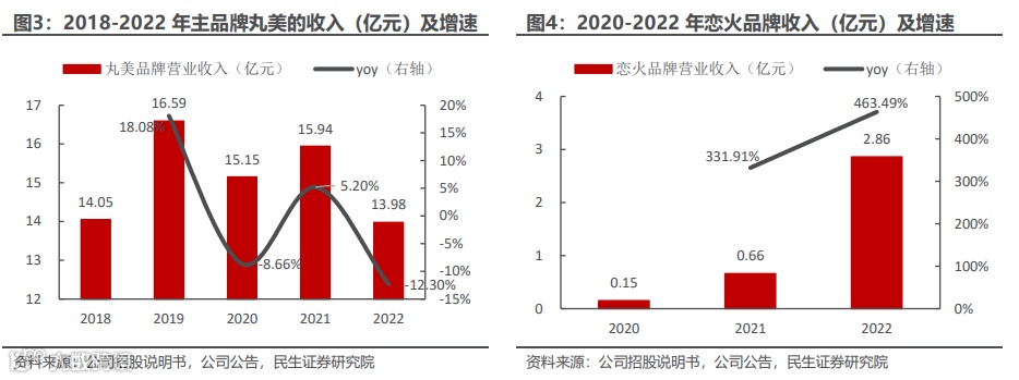 分品牌看,主品牌丸美贡献主要收入,彩妆品牌恋火快速增长。2018-2022年,主品牌丸美收入分别为 14.05/16.59/15.15/15.94/13.98 亿元,占比分别为89.25%/ 92.17%/ 95.06%/ 92.36%/ 80.81%,为公司主要收入来源。恋火品牌收购于 2017 年,2021 年恋火品牌开始转型,聚焦底妆品牌,实现快速放量,2021-2022 年 恋火品牌 分 别 实 现 收 入 0.66/2.86 亿 元 , 同 比 增 速 分 别 为+331.91%/+463.49%,收入占比也从 20 年的 3.70%提升至 22 年的 16.51%,目前恋火品牌仍处于持续放量的高速成长期。