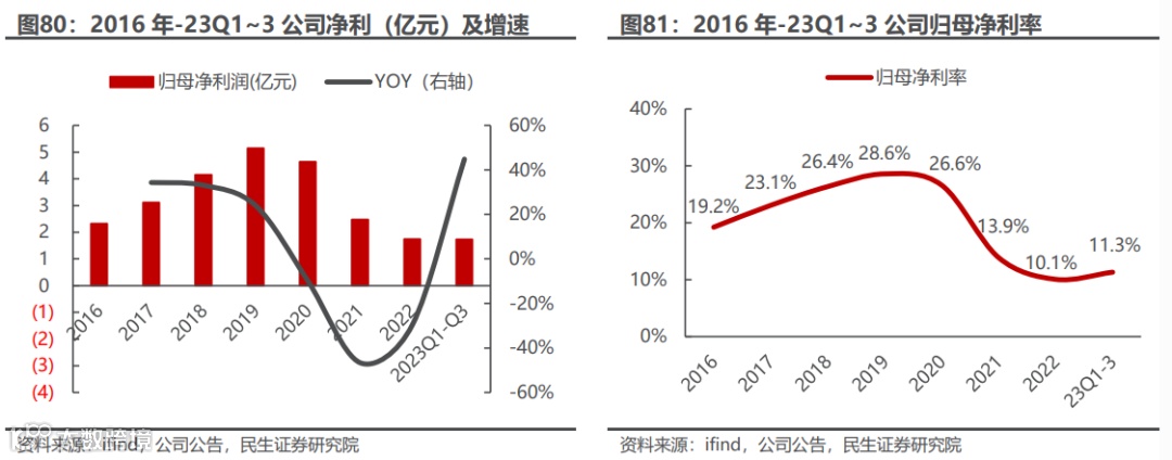 费用率变动影响利润表现,23Q1~3归母净利率为11.31%。2016-2020年,公司归母净利从2.32亿元增至4.64亿元,对应归母净利率从19.22%提升至26.61%。2021-2022年,在公司毛利率快速提升6.84pct至70.84%的情况下,受疫情扰动、布局新渠道及拓展新业务致各项费用增长等因素影响,公司归母净利率增长承压,从13.87%降至10.06%。2023年Q1~3,公司实现归母净利1.74亿元,对应归母净利率11.31%,同比+0.82pct,随公司营业收入增长及产品结构优化,公司盈利能力小幅回升。