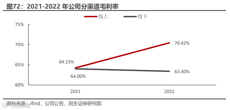分渠道看,线上渠道毛利率增长明显,线下渠道毛利率小幅下滑。2021-2022年,公司战略性推进线上转型,持续调整优化货盘及团队架构,提升线上业务精细化运营水平,线上渠道毛利率从64.23%增长至70.42%;线下渠道受大环境冲击,毛利率从2021年的64.00%降至2022年的63.40%。