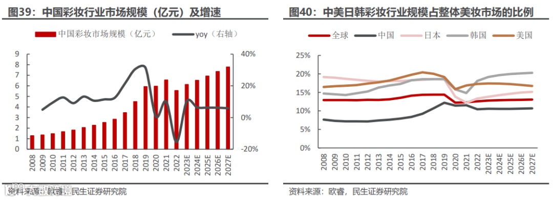 彩妆行业市场持续扩大,预期2027年市场规模占美妆整体市场的11%,对标海外渗透率仍有提升空间。欧睿数据显示,2008-2021年,我国彩妆行业市场整体呈增长态势,市场规模从128.45亿元增至656.52亿元,对应CAGR为13.37%;2022年疫情影响下消费者外出减少,彩妆行业承压明显,市场规模同比-15.40%至555.30亿元;2023年及以后随消费场景恢复,彩妆市场规模有望恢复增长。欧睿数据预测,到2027年底,我国彩妆行业市场规模有望达到778.64亿元,22-27年CAGR为7.00%,恢复稳健增长。从渗透率看,我国彩妆行业市场规模占美妆整体市场的比例从2008年的8%提升至2022年的10%,并预计在2027年提升至11%,与全球(13%)、日本(15%)、韩国(20%)、美国(17%)的水平相比仍有提升空间。