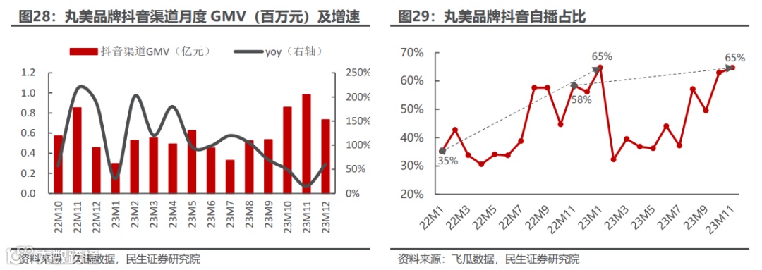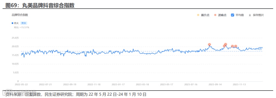 把握新兴渠道流量红利,重点发力抖音、快手等直播平台。自2020年启动线上转型以来,公司在夯实天猫、唯品会等传统货架电商发展的同时,重点布局线上抖音、快手等新兴直播渠道。在直播团队方面,公司合作李佳琦等超头主播、中腰部主播、网络红人、美妆博主高效促进产品销售;同时加强公司内部主播培训和管理,提升抖快自播占比,降低对“达人”的依赖,推动抖快直播业绩良性增长。根据久谦、飞瓜数据,2023年丸美品牌抖音渠道同比实现良好增长,23年11月抖音实现GMV 0.98亿元,同比+14.81%;丸美品牌抖音的自播占比从22年1月的约35%提升至23年11月的65%+,“达人”依赖度大幅降低。